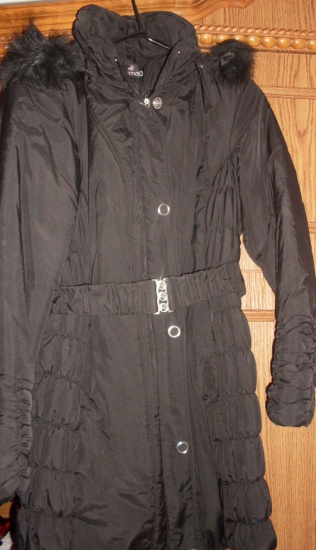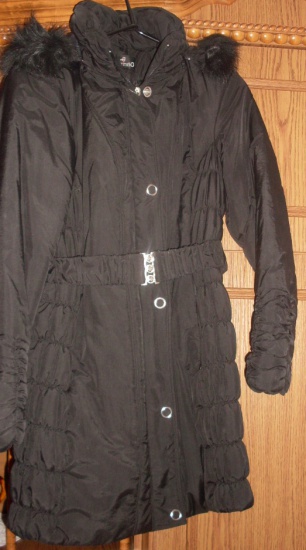 Sprzedam damski płaszcz zimowy rozm.42 kolor czarny z kapturem i paskiem. Wymiary płaszcza długość od stójki do dołu to 89cm, szerokość pod pachami to od 57 do 61cm - płaszcz się rozciąga bo na bokach ma przeszycia z gumki.